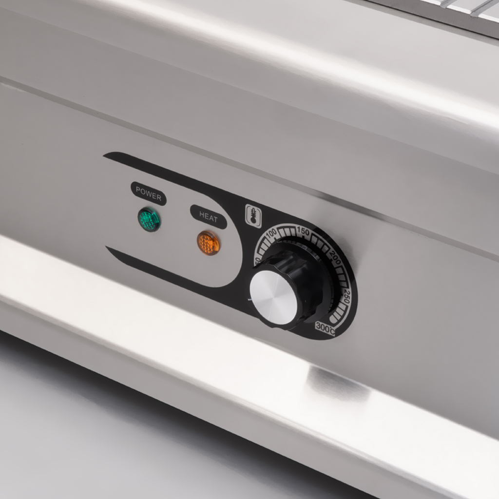 Dankzij de krachtige 400volt aansluiting warmt de bakplaat snel op en blijft hij constant op de juiste temperatuur, zodat u perfecte resultaten kunt behalen. De RVS constructie maakt de bakplaat duurzaam en gemakkelijk schoon te maken.