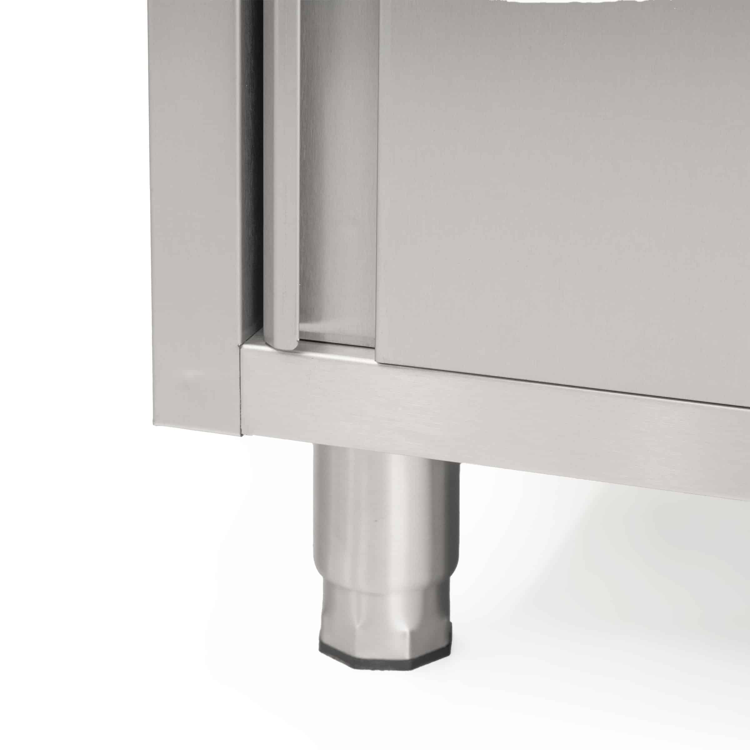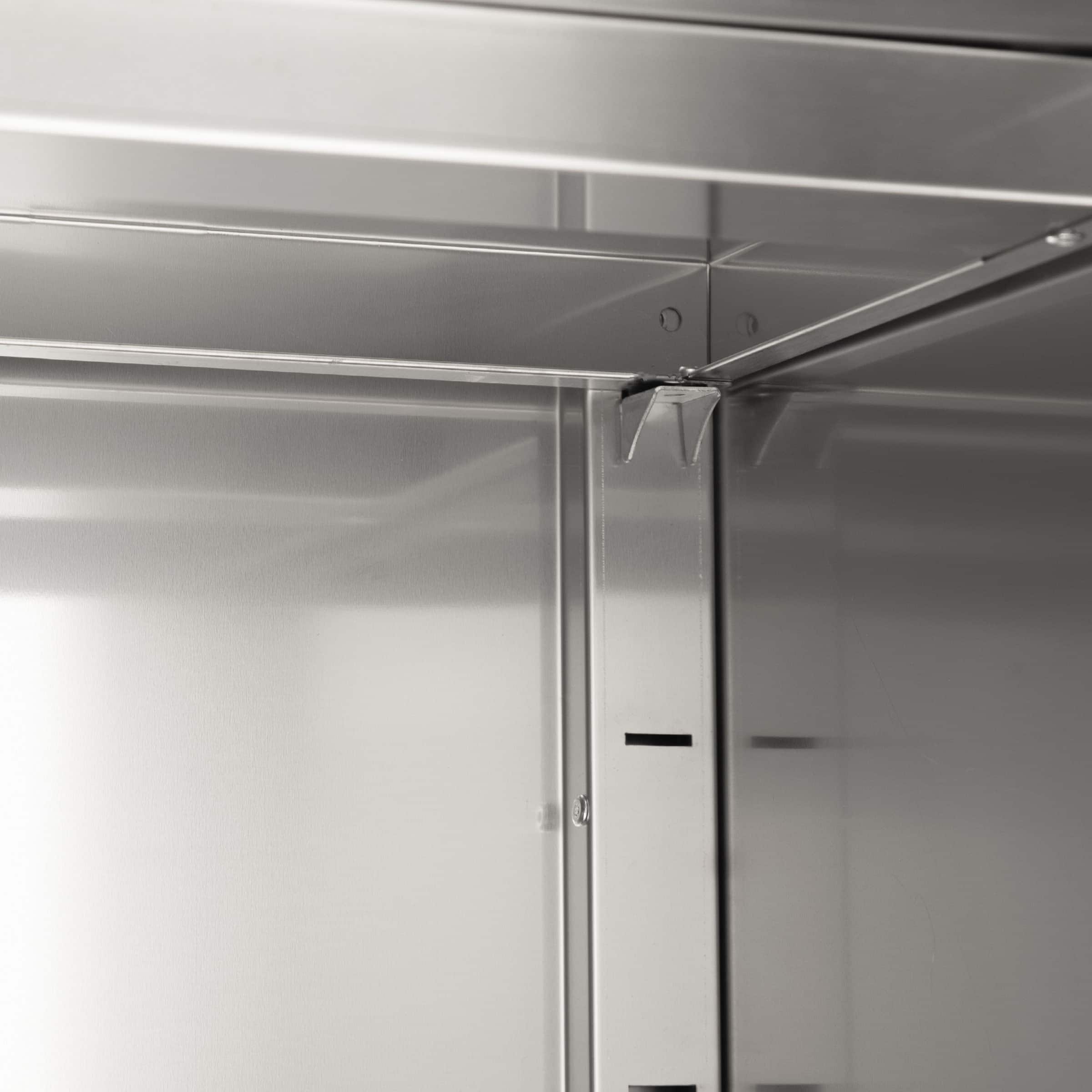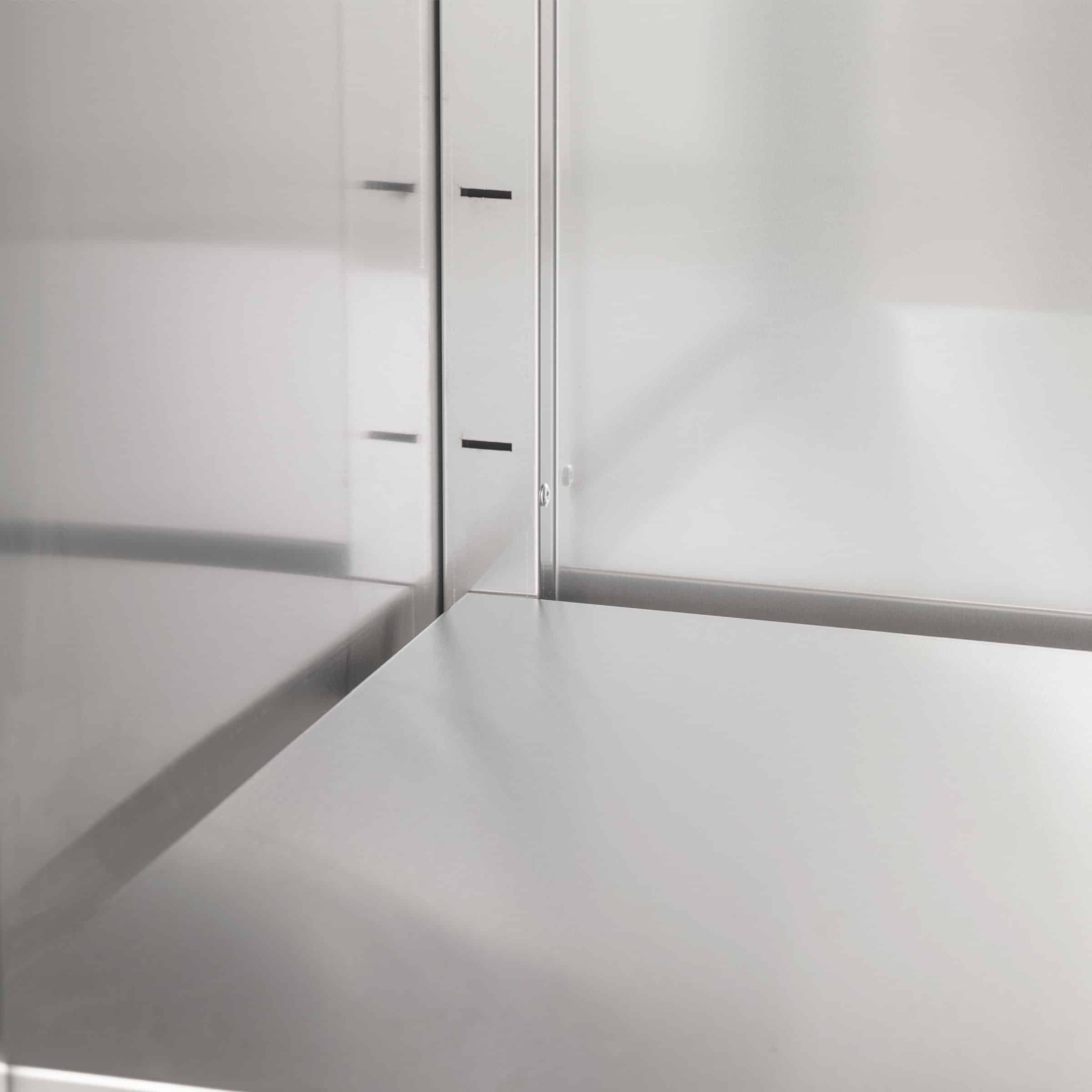 Gemaakt van hoogwaardig AISI 430 roestvrij staal, is deze kast bestand tegen vocht, temperatuurschommelingen en zware belasting. De draaideuren zorgen voor gemakkelijke toegang tot de inhoud, terwijl het robuuste ontwerp garant staat voor stabiliteit en langdurige inzetbaarheid.