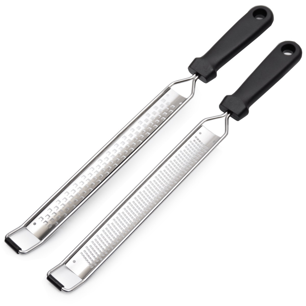 Beide raspen zijn uitgevoerd met een zilverkleurig RVS frame en een stevig zwart kunststof handvat. Dit zorgt voor duurzaamheid, stabiliteit en een comfortabele, ergonomische grip, zelfs bij intensief gebruik in de keuken. Na gebruik kunnen de raspen eenvoudig in de vaatwasmachine, wat tijd scheelt bij het schoonmaken.