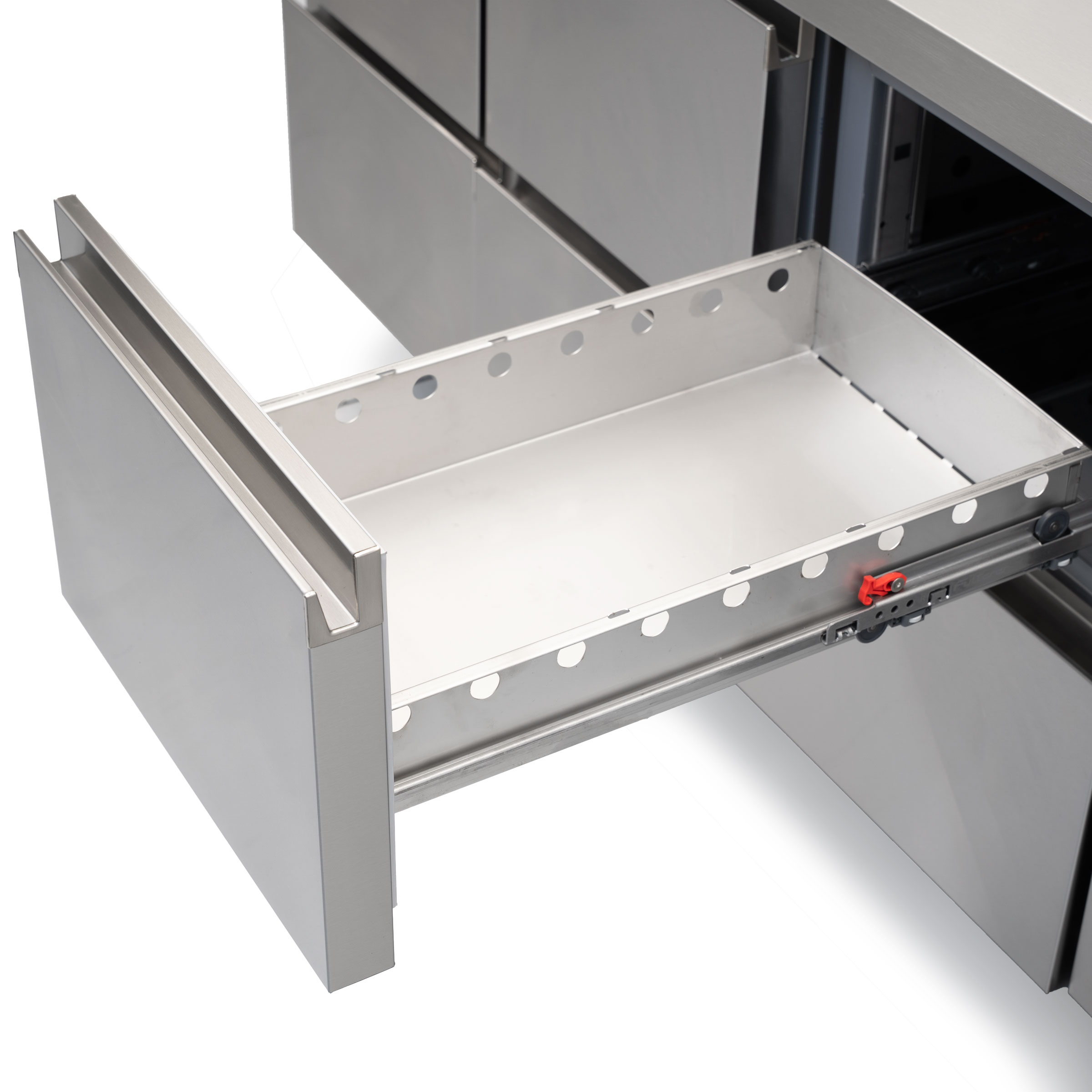 Bovendien beschikt onze koelwerkbank over een duurzaam werkblad dat bestand is tegen zware belasting en perfect is voor het bereiden van uw gerechten. Het biedt voldoende ruimte om allerlei werkzaamheden op te kunnen verrichten. Bovendien is het apparaat gemakkelijk schoon te maken en te onderhouden, waardoor u een hygiënische en veilige omgeving kunt handhaven.