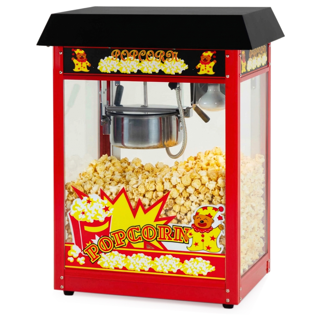 Professionele popcornmachine, energiezuinig en veilig in gebruik. Frame van aluminiumlegering, robuuste behuizing van gehard glas en rood gepoedercoat staal. De popcorn pan is voorzien van een roereenheid en is eenvoudig te legen dankzij het gebruik van een klem. De servicekant heeft een handige klep voor het scheppen van popcorn en daarnaast een grote draaideur van acrylglas. De kamer is verlicht om de vers gepopte popcorn mooi te presenteren. Met de handige kruimellade onder de kast verwijder je makkelijk niet-gepofte pitten en kruimels. Het duurt ca. 2 minuten om een partij popcorn te maken.