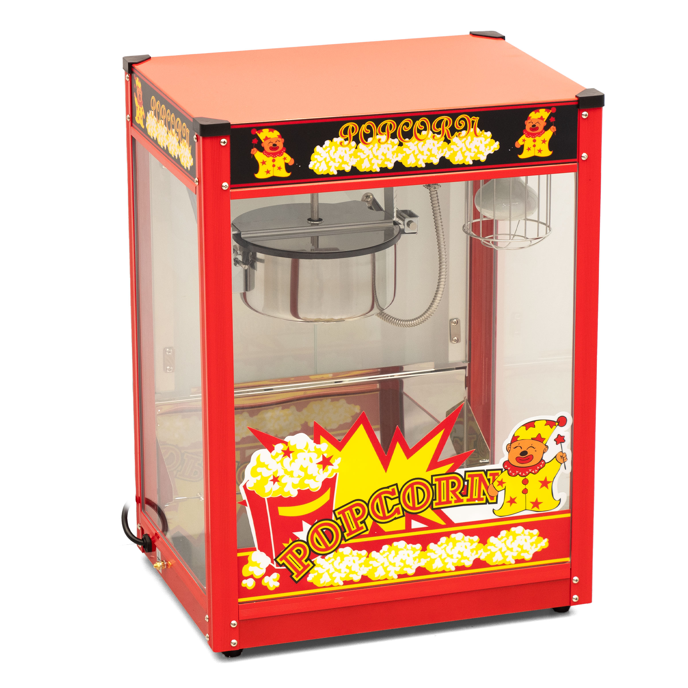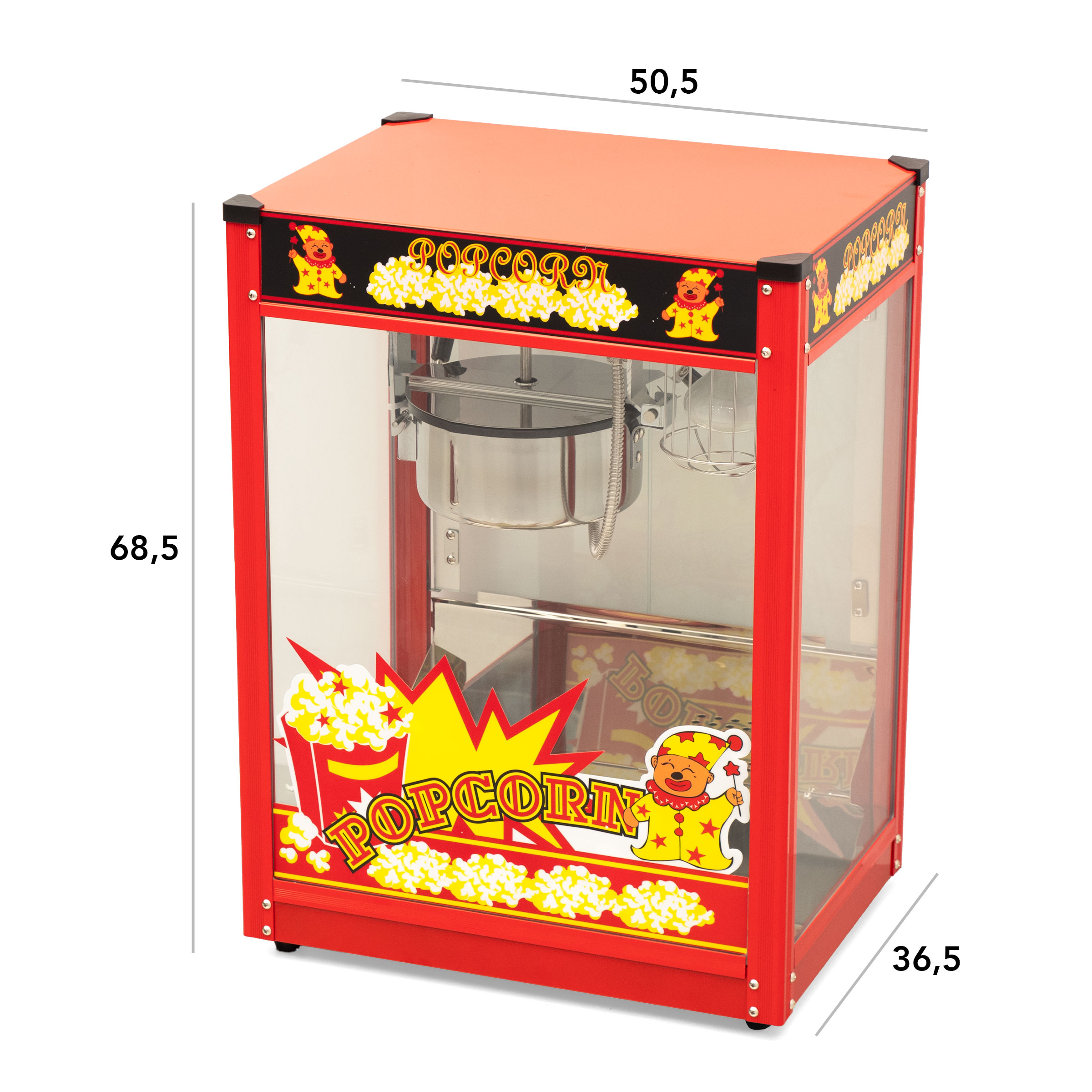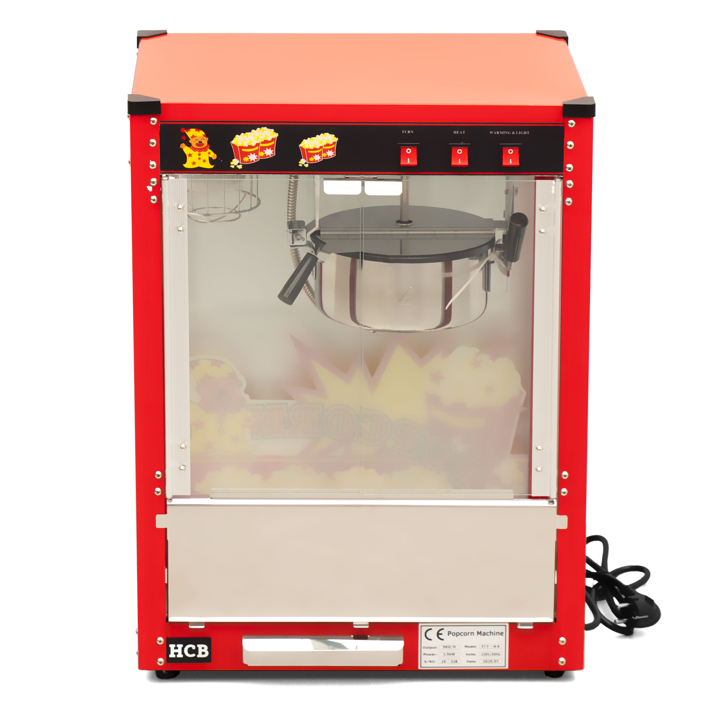 Professionele popcornmachine, energiezuinig en veilig in gebruik. Frame van aluminiumlegering, robuuste behuizing van gehard glas en rood gepoedercoat staal. De popcorn pan is voorzien van een roereenheid en is eenvoudig te legen dankzij het gebruik van een klem. De servicekant heeft een handige klep voor het scheppen van popcorn en daarnaast een grote draaideur van acrylglas. De kamer is verlicht om de vers gepopte popcorn mooi te presenteren. Met de handige kruimellade onder de kast verwijder je makkelijk niet-gepofte pitten en kruimels. Het duurt ca. 2 minuten om een partij popcorn te maken.
