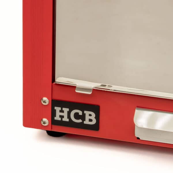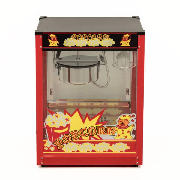 Professionele popcornmachine, energiezuinig en veilig in gebruik. Frame van aluminiumlegering, robuuste behuizing van gehard glas en rood gepoedercoat staal. De popcorn pan is voorzien van een roereenheid en is eenvoudig te legen dankzij het gebruik van een klem. De servicekant heeft een handige klep voor het scheppen van popcorn en daarnaast een grote draaideur van acrylglas. De kamer is verlicht om de vers gepopte popcorn mooi te presenteren. Met de handige kruimellade onder de kast verwijder je makkelijk niet-gepofte pitten en kruimels. Het duurt ca. 2 minuten om een partij popcorn te maken.