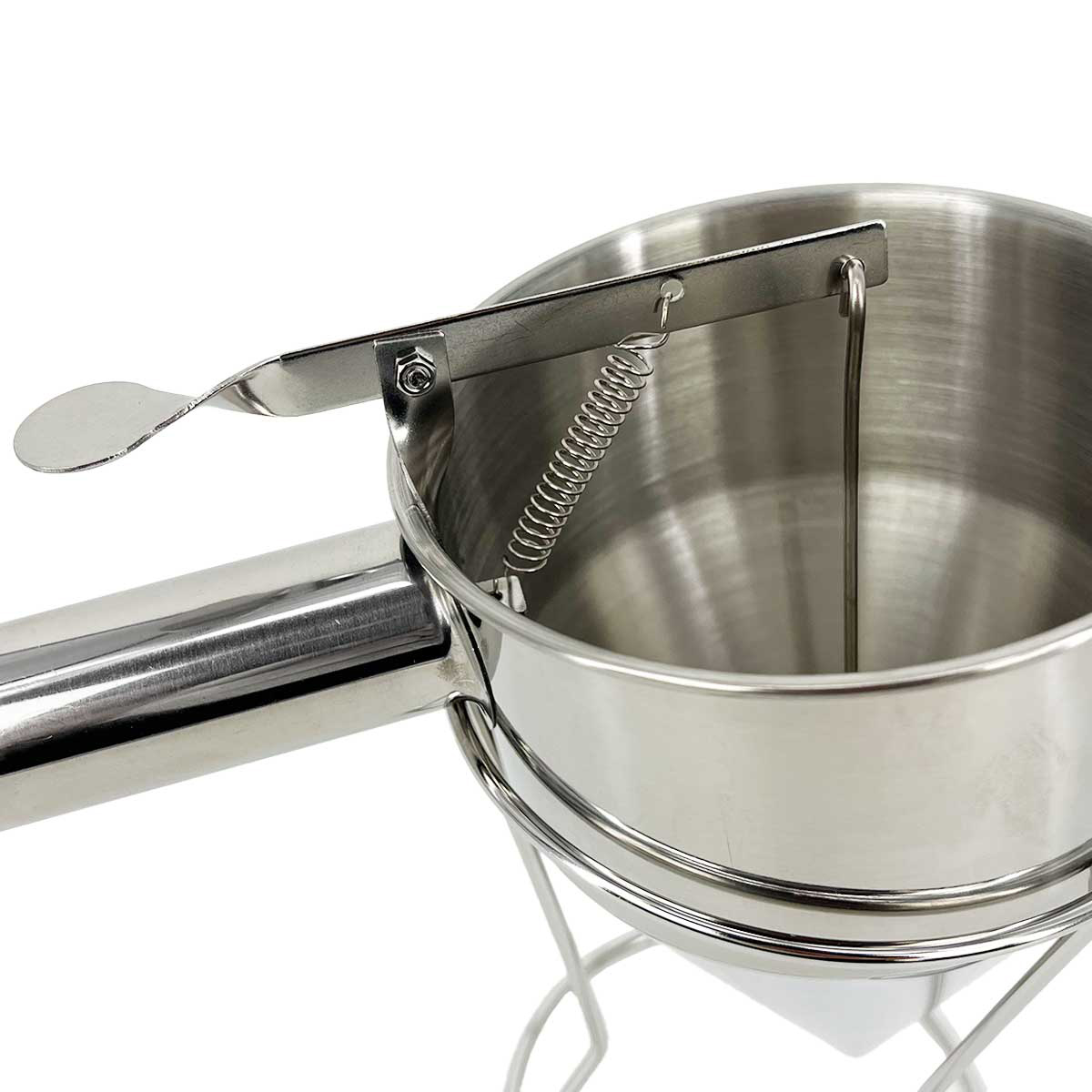 Maak het RVS Portioneertrechter Beslagdispenser, compleet met statief, voor nauwkeurig en moeiteloos gieten van beslag. Deze dispenser is ontworpen met jouw behoeften in gedachten, met een focus op duurzaamheid, precisie en gebruiksgemak.