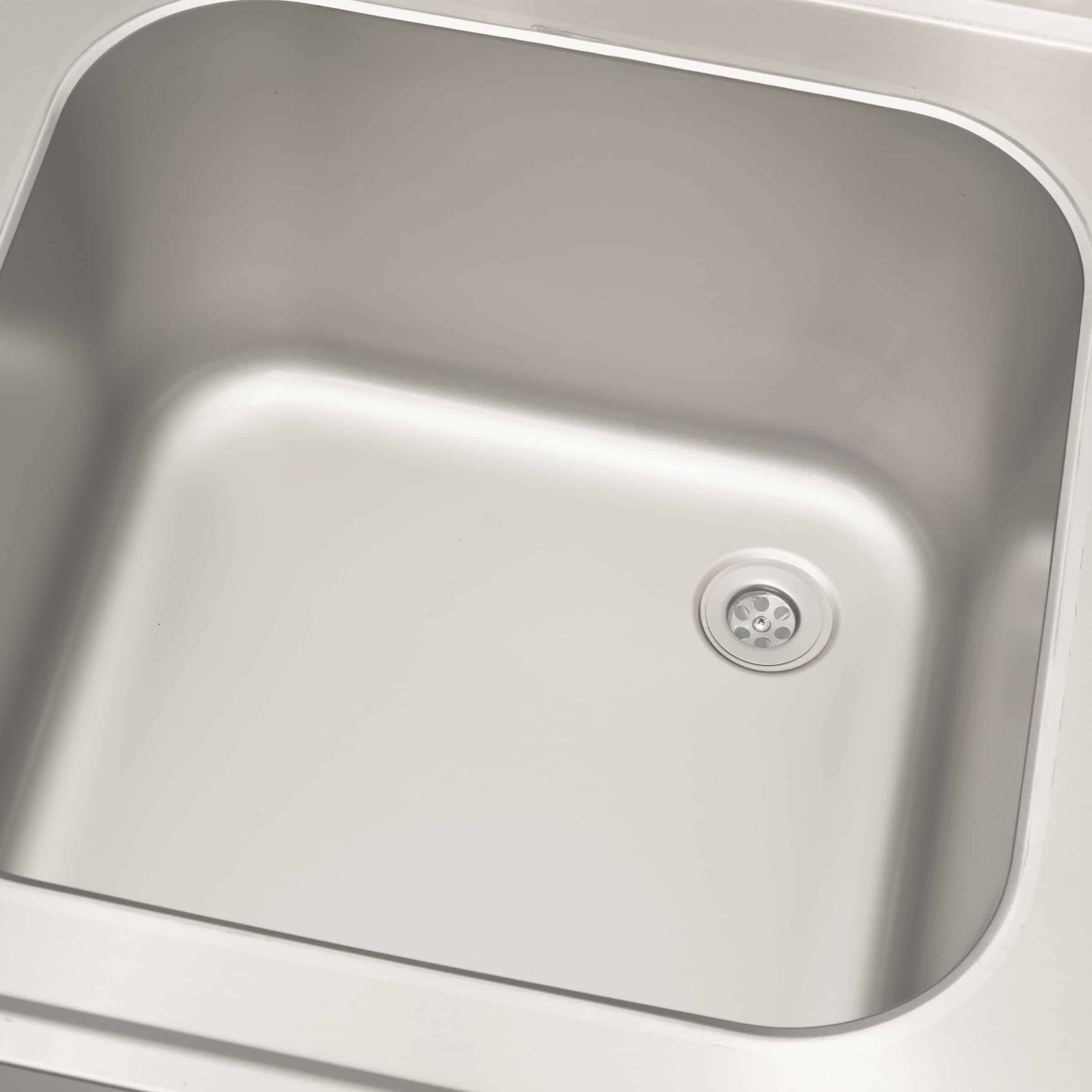 De spoeltafel is volledig uitgevoerd in hoogwaardig RVS, eenvoudig schoon te maken en bestand tegen vocht, schoonmaakmiddelen en intensief gebruik.