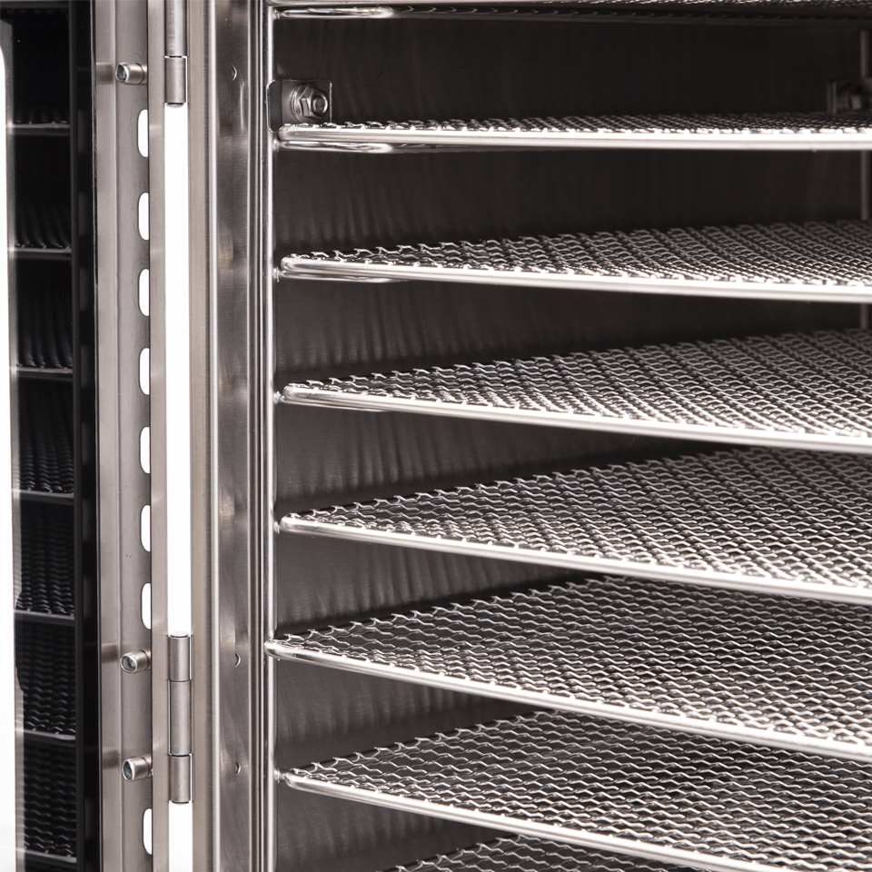 De 12 RVS-droogrekken bieden veel capaciteit op een compact oppervlak. Dankzij de afstand van 30 mm tussen de rekken circuleert de warme lucht optimaal, waardoor producten gelijkmatig drogen. De RVS-behuizing is robuust, hygiënisch en eenvoudig te reinigen – perfect voor intensief professioneel gebruik.